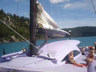 No puedo más que decir maravillas del sitio donde estuvimos y en que además, todo nos cuadró a la perfección: hostal, tours, actividades...y un largo etc. El sitio a donde nos dirigíamos era Airlie Beach, una bonita localidad costera con su puerto deportivo, tiendas, bares, playa, lagos artificiales para bañarte y otras cosas. El lugar para nada estaba masificado y su entorno , en medio de bosques que llegaban al borde del mar, era maravilloso. Llegamos la tarde-noche del martes y cogimos la habitación del backpacker. El hostal estaba muy bien,en primera línea de playa. Encima tuvmos la gran suerte de que, con el mismo precio, nos dieron una habitación con el baño incluido cuando aquí eso es muchisimo más caro. Fue una suerte no tener que compartirlo. Por otro lado, ¿Qué hacer alli? Las principales atracciones que ofrece el lugar son excursiones a dos de los lugares más emblemáticos de Queensland y por qué no, de Australia: el archipiélago de Whitsundays y la Gran Barrera de Coral. Airlie Beach está lleno de oficinas que ofrecen todo tipo de paquetes con tours y los hay de distintos precios. Finalmente, y gracias a mi carnet de estudiante de aquí y a que Araceli se hizo el carnet de backpacker, cogimos una oferta increible que nos llevaría a los dos sitios.